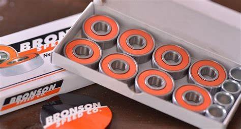 Bronson Speed Co. G2 Next Generation Bearings designed for today's skateboarding. Deep Groove Raceways. Balls roll deep in raceway channels. Reduces side impact damage & breakage. Straight Edge, Removable Frictionless Shields. Pop off resistant. Hold oil in, dirt and moisture out. Easy to clean. High Speed Oil. Custom engineered light oil lubricant is water, oxidation and corrosion resistant for extended wear protection. Box/8 Bearings, 4 Spacers, & 8 Axle Washers