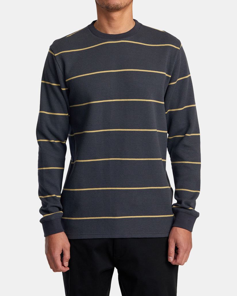 Boost your warmth and your daily style with RVCA Men's Dayshift Collection Dayshift Thermal Stripe Long Sleeve Top. Crafted of cozy waffle fabric, this classic crew neck shirt comes in a new range of colorways with yarn-dyed stripes.