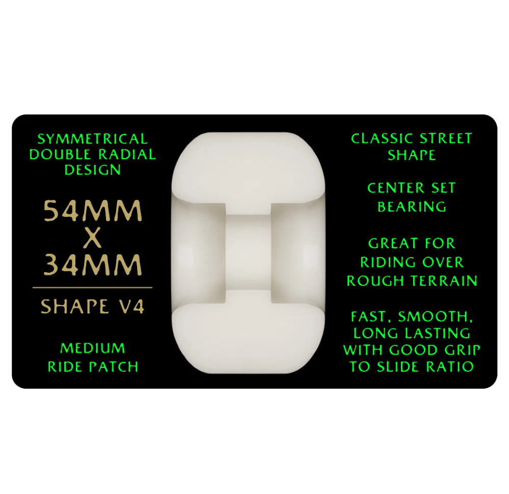 V4 Shape – Symmetrical double radial design / Classic street shape / Medium ride patch / Center set bearing