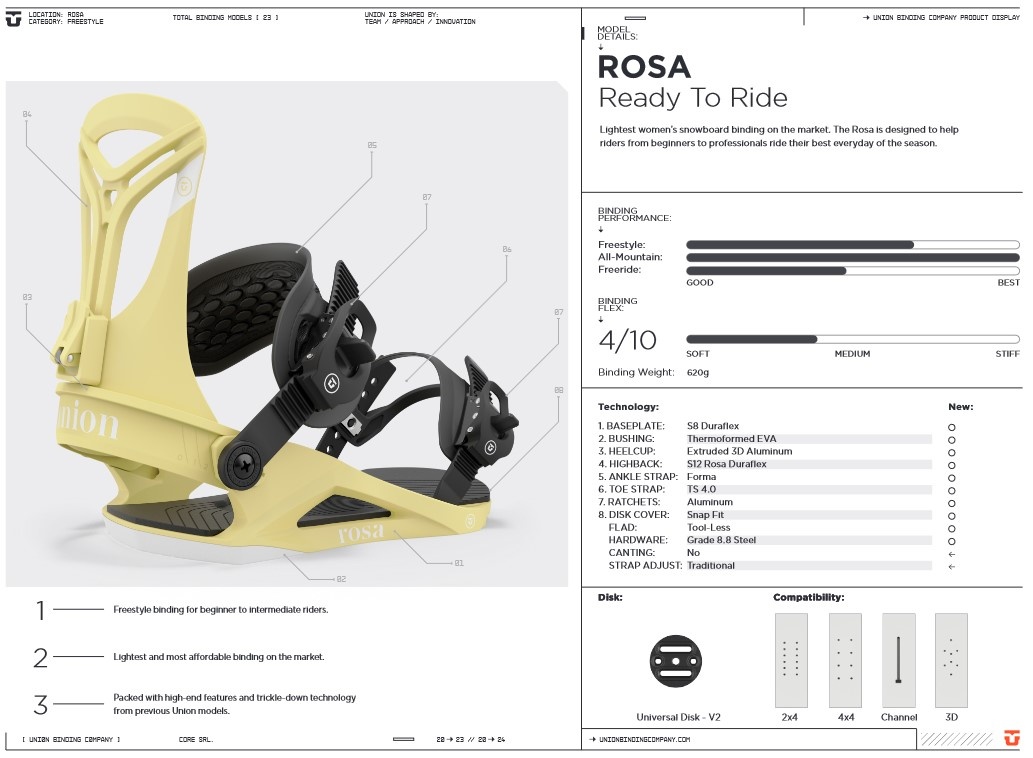 Strap in to the lightest women's snowboard binding on the market. The Union Rosa is a lightweight, soft flexing, freestyle snowboard binding for beginner to intermediate snowboarders. Perfect for learning to ride the entire mountain or taking your first park laps.