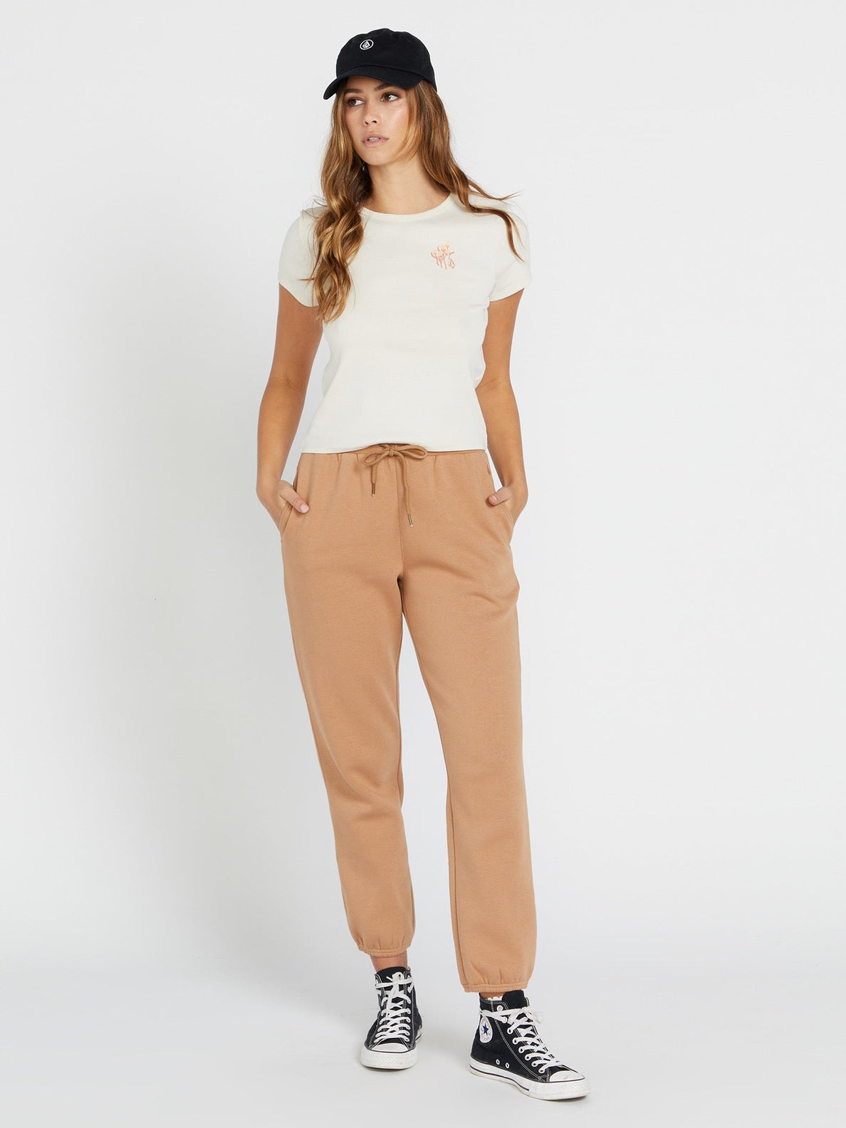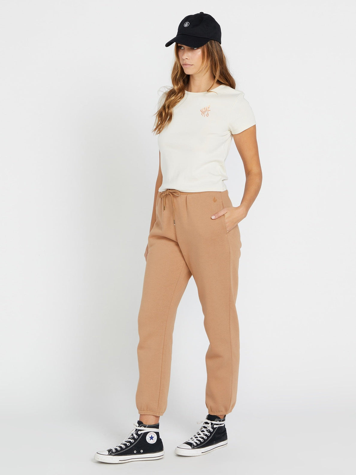 Stone embroidery at hip and Volcom embroidery at back leg