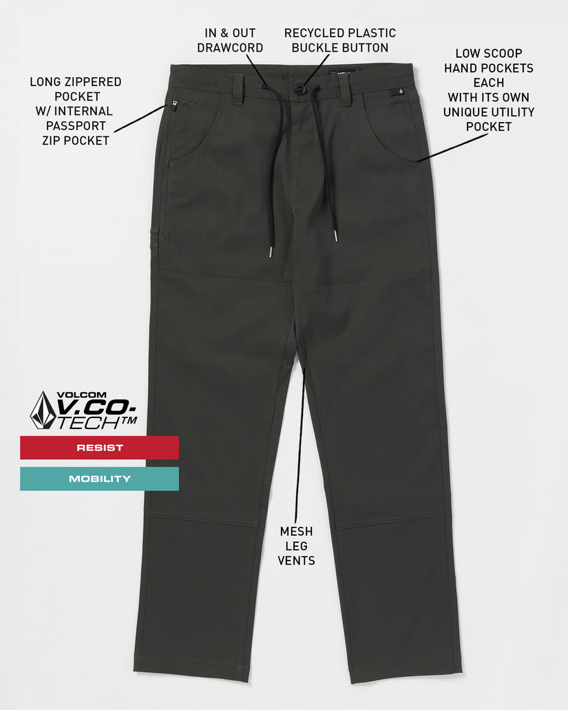 You'll be ready to conquer any terrain in these. Equipped with Volcom's V.Co-Tech water-repellent and anti-microbial technology, these black pants offer functional features like multiple utility pockets, a drawcord waistband, and a relaxed fit that's perfect for all-day wear. Tackle the trail or just chill in comfort with these all-purpose pants. Featured here in stealth.