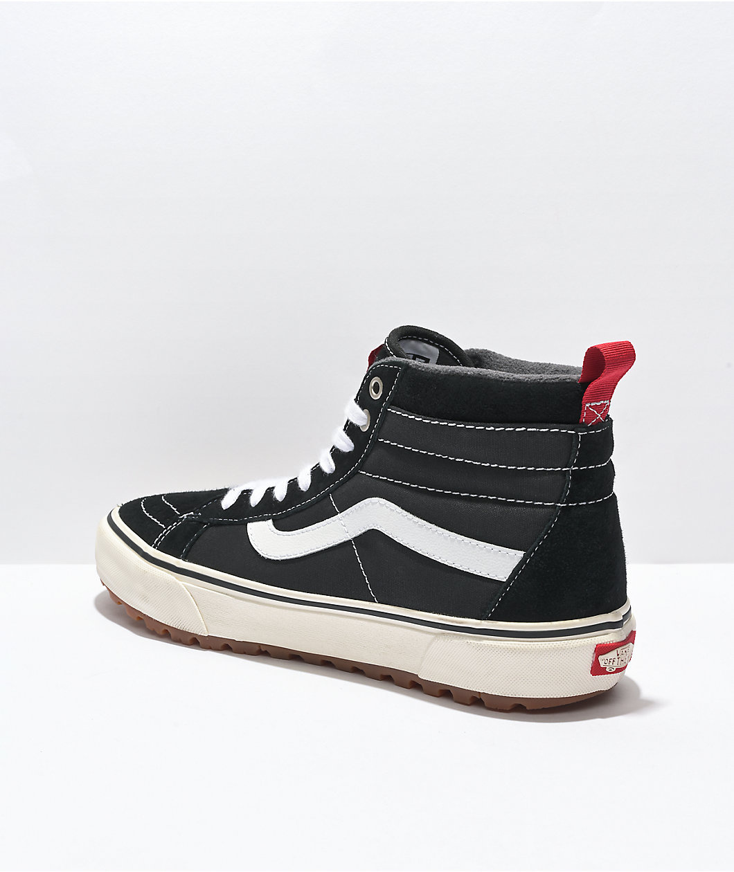 Romp over rough terrain in style with the Sk8-Hi MTE-1 black and white shoes from Vans! The rugged, lugged tread and gum-rubber outsoles give the shoes plenty of grip, while the sturdy ankle-skimming canvas-and-suede uppers lined with PrimaLoft® insulation offer ample warmth and support. With Vans' signature leather logo stripe adorning the sides of the shoes, and additional logo detailing on the tongue and heel, these kicks will lend your looks a dash of outdoor-friendly flair.