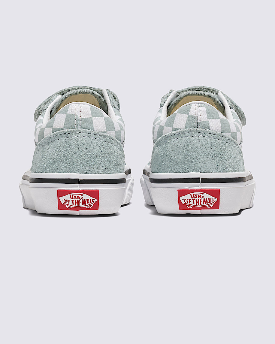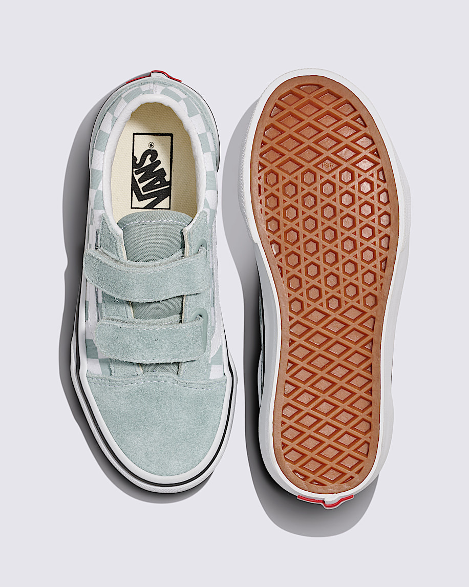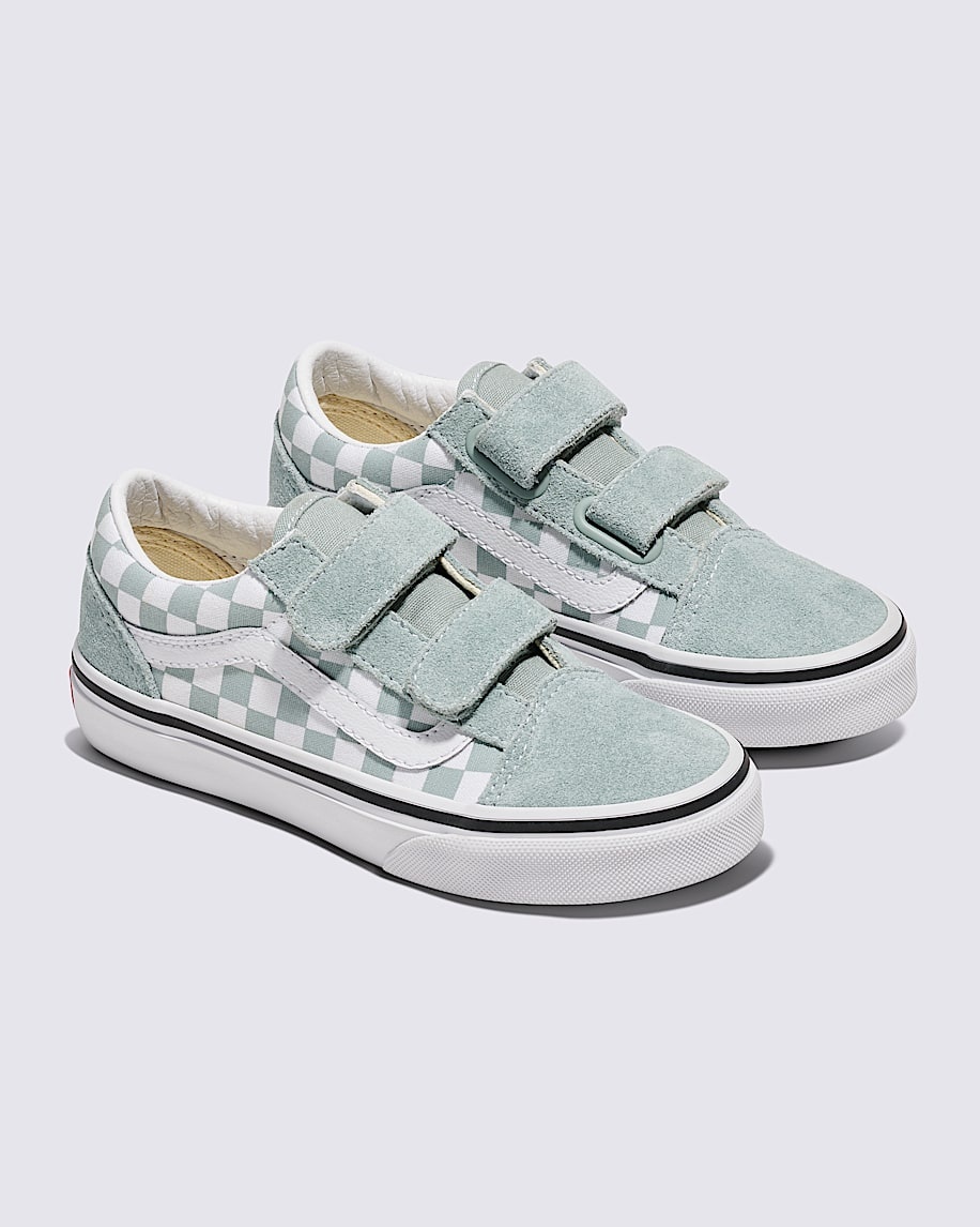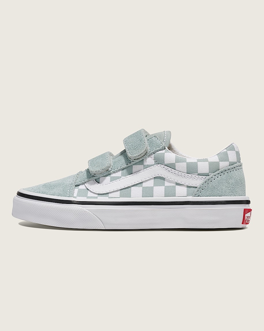 The Vans® Kids Old Skool V sneakers are iconic low-top, Sidestripe shoes that are made of a canvas upper with glitter detail for an eye-catching appeal. Their dual hook-and-loop straps ensure a secure fit. These glitter shoes are made of a rubber insole and cotton lining for all-day comfort. Match your kid's outfits and styles with these low-top shoes.