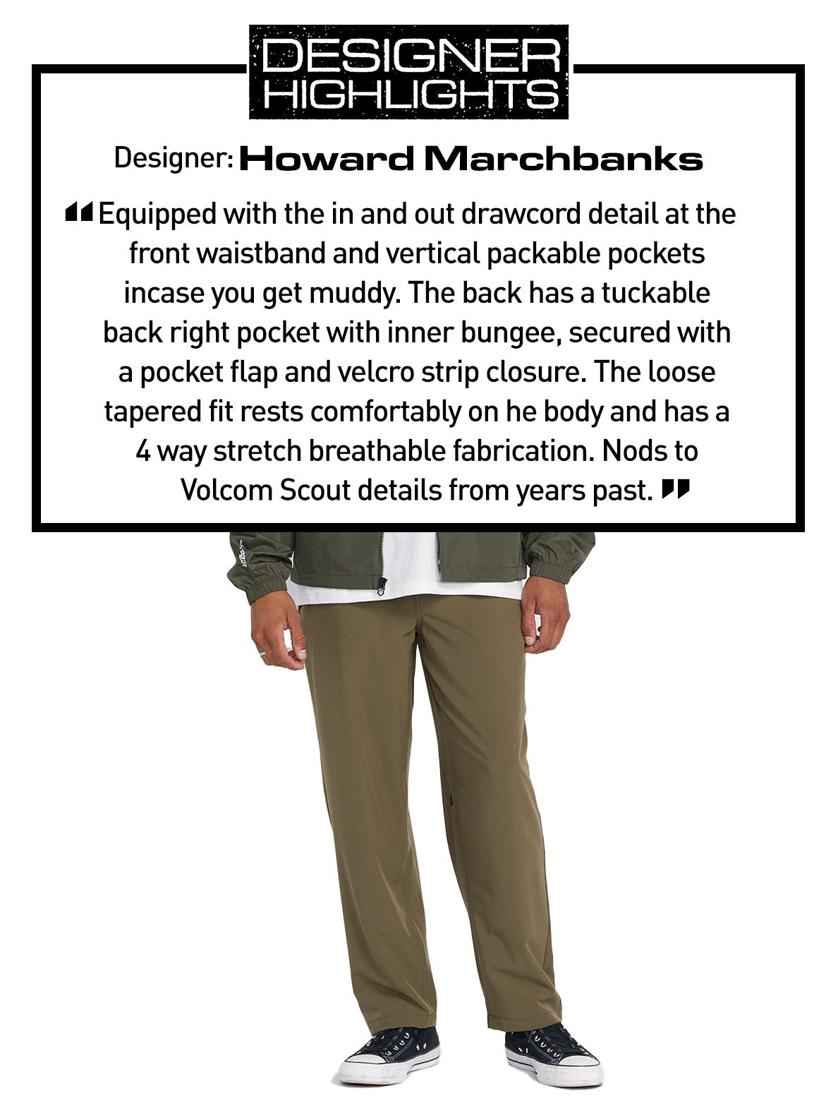 - Loose with a tapered fit, Lightweight multi purpose short with in or out drawcord at center-front waistband, Soft elastic binding / lining at interior waistband, Reversible / packable vertical zip pocket, side dual single welt pocket with invisible zipper, Dual entry back left pocket with side zipper closure, back right pocket is a split welt pocket with tuckable flap, Volcom branded high density printed back belt loop, above back right pocket and at lower left leg