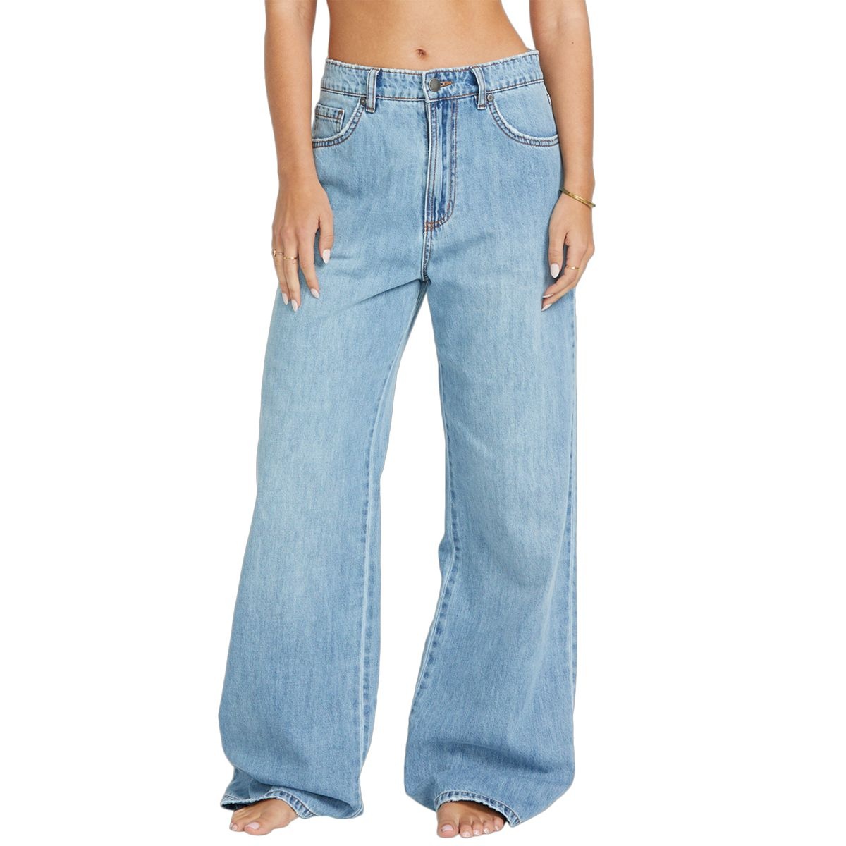 5 pocket denim pant100% cotton cotton denimHigh waist baggy fit rise: 12.5" inseam: 31"Zipper fly with button closureLogo flag label